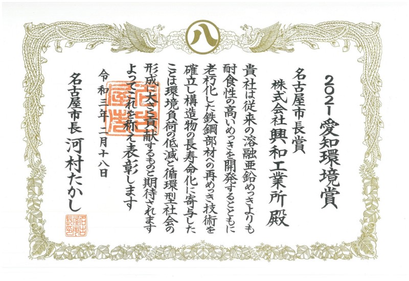 興和(山東)機(jī)械有限公司的日本本社株式會(huì)社興和工業(yè)所于2021年2月18日榮獲2021年度愛知縣環(huán)境保護(hù)獎(jiǎng)。茲用來(lái)表彰株式會(huì)社興和工業(yè)所不同于一般的鍍鋅工藝,在研發(fā)使用高耐腐蝕性電鍍技術(shù)的同時(shí),通過對(duì)老化鋼材的再電鍍技術(shù),實(shí)現(xiàn)了構(gòu)造物壽命的延長(zhǎng),對(duì)環(huán)境保護(hù)及構(gòu)建循環(huán)型社會(huì)做出了重大貢獻(xiàn)。